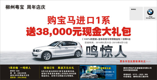 柳州粵寶將在本展廳舉辦BMW1系專場促銷活動,現(xiàn)場訂車在原價基礎(chǔ)上享受38,000元的現(xiàn)金折讓,還有萬元驚喜大禮等著您。