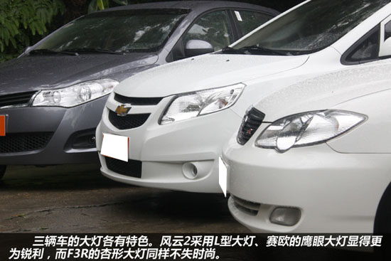 三輛車(chē)的前大燈各有特色。風(fēng)云2采用L型大燈,造型不算很特別,但與前臉整體造型非常協(xié)調(diào)。賽歐兩廂的鷹眼大燈顯得更為銳利,追求個(gè)性的朋友可改裝天使眼大燈,保證回頭率大增。而F3R的杏型大燈同樣不失時(shí)尚,但看久了恐怕會(huì)有點(diǎn)審美疲勞。