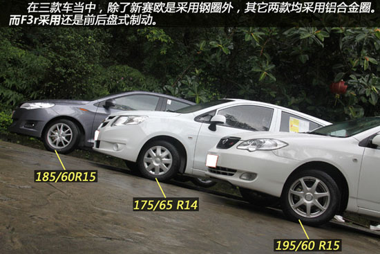 在這三款車(chē)中,除了新賽歐是采用鋼輪轂外,其他兩款均采用鋁合金輪轂。剎車(chē)方面,除了F3R采用四輪碟剎之外,其余兩款車(chē)型都只用了前碟后鼓的搭配。
