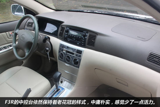 F3R的中控臺依然保持著豐田老花冠的樣式,中庸樸實,雖然感覺溫馨,但似乎少了一份活力。儲物空間也不是很多。方向盤,儀表臺,空調(diào)部分均與老花冠一致,有點審美疲勞的感覺。比較安慰的是音響部分增加了AUX接口,具有一點點的擴展能力。