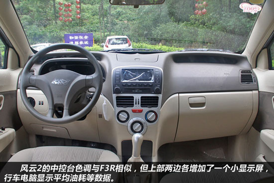 風云2的中控臺色調(diào)與F3R相似,在中控臺的上部兩邊各增加了一個小顯示屏,顯示平均油耗、車內(nèi)和車外溫度、時間等信息,比F3R顯得更有科技感。雖然用料與樣式都不算上盛,但造工與奇瑞之前的車型相比,有明顯進步是可以肯定的,但仍需繼續(xù)努力才能趕上合資品牌的水平。