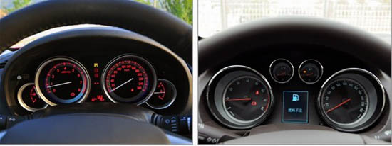 睿翼轎跑(左圖)的自發(fā)光儀表盤采用紅色背光,新君威(右圖)的儀表盤則采用冰川藍(lán)背光