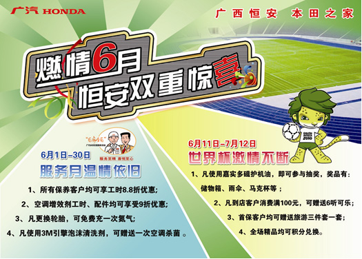 2010年的6月-7月,舉世矚目的世界杯足球賽在南非舉行,32支來自世界各國的參賽隊(duì)伍將在南非的綠茵場上盡顯風(fēng)采,他們的戰(zhàn)績?nèi)绾,恒安本田與您一起關(guān)注。6月1日-30日正值廣汽本田“樂享盛夏,感恩隨行”夏季服務(wù)月活動(dòng),因此,在南非世界杯期間,恒安本田將開展系列活動(dòng),與車友和球迷歡慶世界杯。