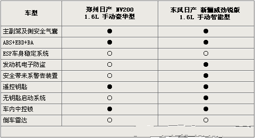 在安全方面,NV200和新驪威都配備了防抱死、制動(dòng)力分配等系統(tǒng),車(chē)內(nèi)同時(shí)安裝了主副駕安全氣囊,為駕乘人員平添了一份安全性。但新驪威更加注重車(chē)輛整體安全,較NV200多出了發(fā)動(dòng)機(jī)防盜、安全帶未系警告的配置。新驪威配備的無(wú)鑰匙進(jìn)入系統(tǒng)讓車(chē)主得到了很大便利,大大提升了檔次感。但可惜兩款車(chē)均未裝配倒車(chē)?yán)走_(dá),在泊車(chē)入位的時(shí)候要多加注意車(chē)輛后方,以免帶來(lái)不必要的損失。