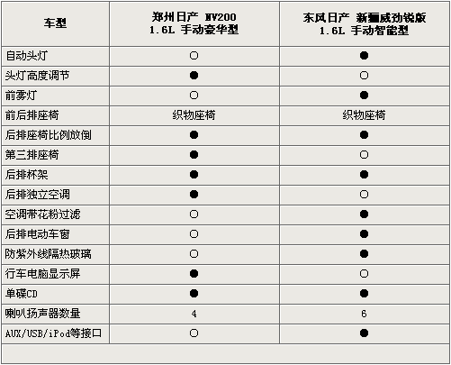 新驪威帶有自動(dòng)頭燈以及前霧燈,在車(chē)輛夜間或霧天行駛時(shí)增加了一份安全,同時(shí)在操作上也更加便捷。NV200則裝備了大燈高度調(diào)節(jié),可根據(jù)自身需要調(diào)整大燈的照射高度。兩款車(chē)為了降低成本以及實(shí)用性,全車(chē)均為織物座椅,但在舒適性上完全可以接受。NV200的第三排座椅大大增強(qiáng)了實(shí)用性,并且在日常也可作為儲(chǔ)物空間使用。新驪威帶的空調(diào)帶有花粉過(guò)濾功能,并且配備了后排電窗及隔熱玻璃,充分顯示出對(duì)車(chē)內(nèi)駕乘人員的關(guān)護(hù)。而NV200的行車(chē)顯示屏也可以使駕駛者進(jìn)一步了解油耗等車(chē)輛實(shí)時(shí)信息。新驪威配備的6揚(yáng)聲器音響及外接音源接口可以使駕車(chē)變?yōu)楦酉硎,同時(shí)對(duì)喜歡音樂(lè)的朋友來(lái)說(shuō)也更加的便利。