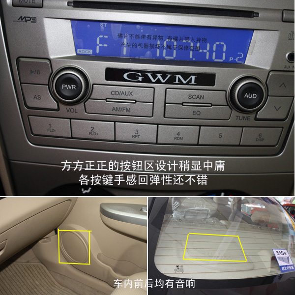 騰翼C30車內(nèi)前后各兩個(gè)揚(yáng)聲器,另音響有多種音效模式可調(diào),音響效果還不錯(cuò)!
