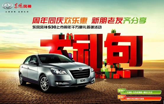 以硬朗、實(shí)在著稱的"中級(jí)車英雄"東風(fēng)風(fēng)神S30上市周年悄然而至。東風(fēng)風(fēng)神攜全國99家種子專營店隆重推出"周年同慶歡樂惠 新老朋友齊分享"活動(dòng),傾情回饋東風(fēng)風(fēng)神S30新老車主,將實(shí)惠進(jìn)行到底。