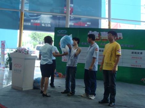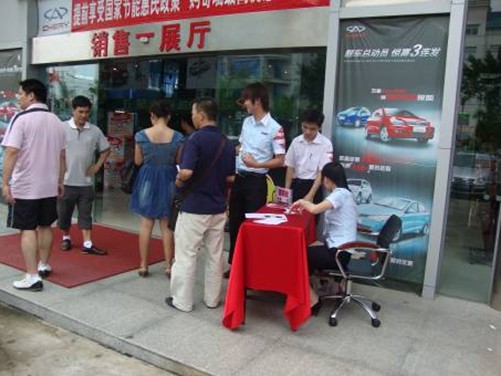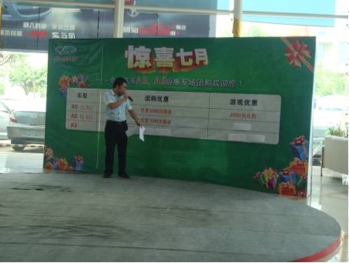2010年7月25日在科園大道55號(hào)廣西鑫廣達(dá)奇瑞4S店舉行的“驚喜七月—--奇瑞汽車(chē)A3、A5專(zhuān)場(chǎng)團(tuán)購(gòu)”活動(dòng)圓滿(mǎn)結(jié)束了;顒(dòng)當(dāng)天,由銷(xiāo)售經(jīng)理親自主持本次專(zhuān)場(chǎng)活動(dòng),成績(jī)喜人,現(xiàn)場(chǎng)訂交22臺(tái)。