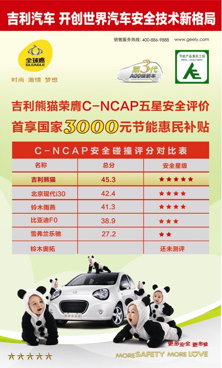 在2009年12月29日,中國汽車技術(shù)研究中心在天津公布了09年第四批6個車型的評價結(jié)果,吉利熊貓以45.3分的成績,成為首款獲得五星安全的A00級小車。