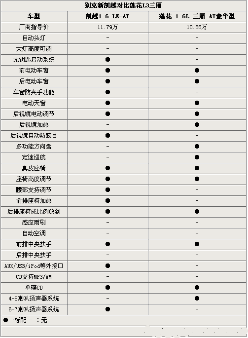 從價格上來看,兩款車型有將近10000元的差距,配置豐富度上面新凱越的優(yōu)勢比較明顯。其中包括無鑰匙孔啟動、車門防夾手、后視鏡自動防眩目、腰部調(diào)節(jié)、座椅加熱、音頻接口、音響系統(tǒng)等7項突出配置。當然了,蓮花L3也并非一無是處,多功能方向盤、定速巡航、后視鏡加熱、后排中央扶手等配置也是別克新凱越所不具備的。不過購車者要忘記,現(xiàn)在新凱越在各家4S店銷售中都有著少則過萬的優(yōu)惠幅度,如此看來在性價比方面蓮花L3可就要稍遜一籌了。