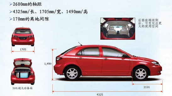 提到兩廂車,人們在贊美其時尚外形的同時,往往會惋惜其空間不足、實用性不高。F3R給車市帶來“大兩廂”的全新概念,讓你無論是出門旅行還是逛街購物都不愁沒有儲物空間。F3R擁有同級車中無可比擬的寬大車身,其長4325毫米、寬1705毫米、高1490毫米,而軸距竟達到2600mm,F3R的后備箱采用掀背開啟式廂門,容積達到360L,頗具實用價值,如此闊綽的空間,完全可以媲美普通三廂車,堪比中高級車標準。