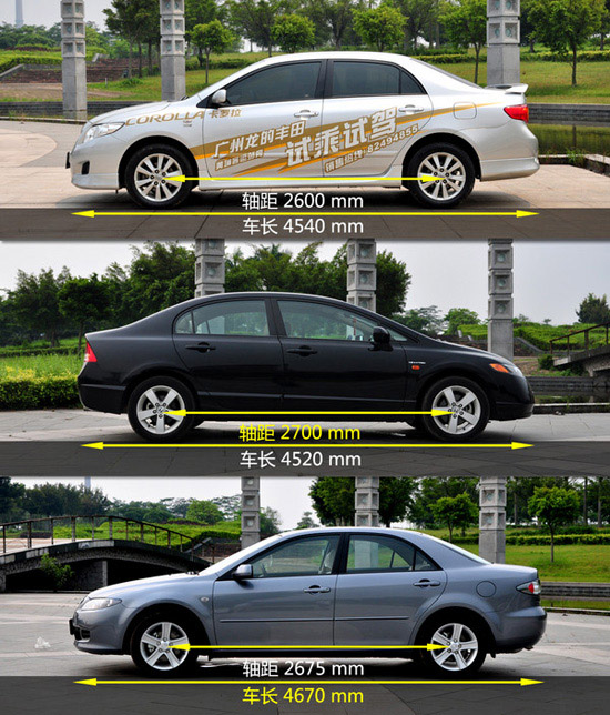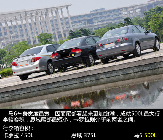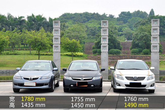 這3款車擺在一起,很有田忌賽馬的感覺。馬自達(dá)6定位是中高級(jí)車,但價(jià)格卻僅比主流的中級(jí)車貴1萬。由于定位不同,馬自達(dá)6擁有三車中最寬的車身尺寸,為1780mm。在高度對(duì)比中,卡羅拉最高,為1490mm。但在后面的對(duì)比中發(fā)現(xiàn),三車的頭部空間均為1拳,不相伯仲,打個(gè)平手。