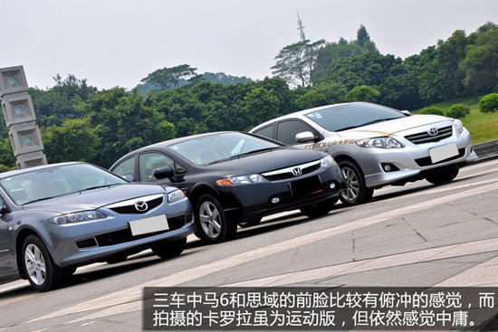 三車中馬自達(dá)6和思域的前臉比較扁平,更有俯沖的感覺。拍攝的卡羅拉雖為運(yùn)動(dòng)版,增加了前大包圍。但斯文人穿上球鞋后,本質(zhì)依然,中庸。