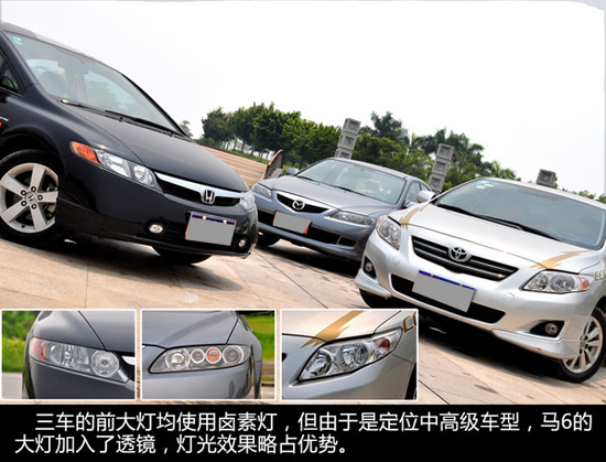 三車的前大燈均使用鹵素?zé)襞,豪華車上的氙氣大燈只能是夢(mèng)想。但由于定位中高級(jí)車型,馬自達(dá)6的大燈加入了透鏡,燈光效果方面略占優(yōu)勢(shì)。