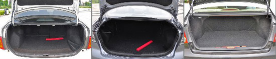 馬自達(dá)6車身最寬,因而尾部看起來更加飽滿,同時(shí)也成就了500L的行李箱容積,為三車之最。思域尾部最短小,行李箱只有375L,相當(dāng)緊湊?_拉則介于前兩者之間,行李箱容積為450升。三車行李箱地板都比較平整,方便行李的放置。