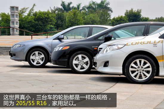 世界真小,三臺(tái)車的輪胎都是同一規(guī)格,同為205/55 R16,都是經(jīng)濟(jì)型取向。205的輪胎寬度足以應(yīng)對(duì)日常使用,但又不至于增加油耗。16寸的輪轂?zāi)軡M足視覺上的需求之外,匹配的輪胎售價(jià)要比17寸的便宜近一半,有效降低日后的使用成本。