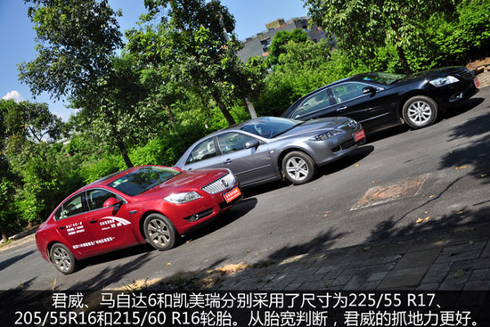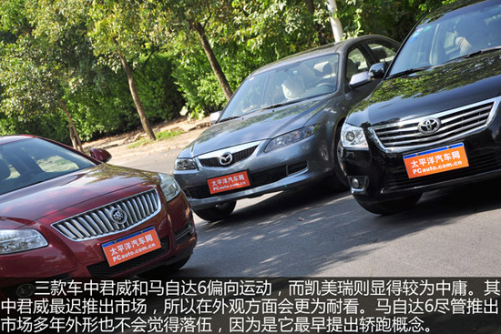 三款車的側(cè)面也是同各自的性格有著莫大的關(guān)系,如君威和馬自達6的線條會更流線,凱美瑞則顯得比較敦厚。從而刻畫出君威和馬自達6的運動感以及凱美瑞的那份中庸之道。