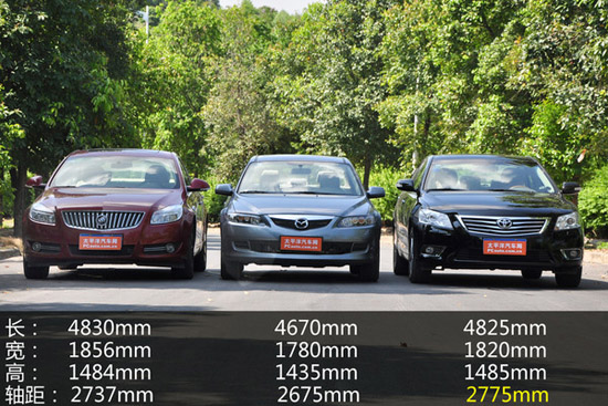 從三款車的尺寸來看,君威的規(guī)格最大,但是軸距凱美瑞達到2775mm,為三款車之最。馬自達6在君威和凱美瑞面前會顯得比較“瘦小”。