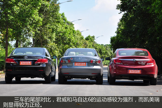 三款車的尾部一樣符合各自的性格特點。君威的尾部更傾向運動,當(dāng)然馬自達6也是一樣,不過可能滿街都是馬自達6,而且推出市場時間較長,缺少了一份個性。凱美瑞仍然是那么穩(wěn)重,與前臉互相呼應(yīng)。