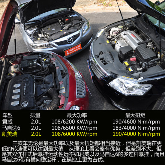 | 操控 | ★★★★ | ★★★★☆ | ★★★☆ | 雙連桿的凱美瑞僅適合家用。而君威以及馬自達(dá)6比較,個人認(rèn)為操控也應(yīng)該和速度結(jié)合在一起,提速好,懸掛支撐強(qiáng),這樣才為之操控感好。 |