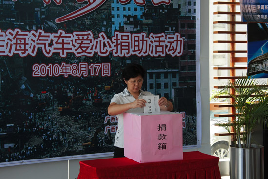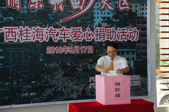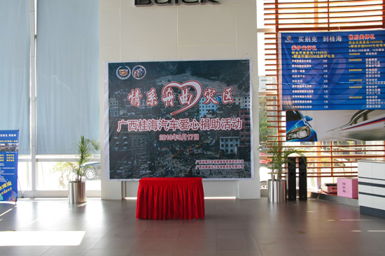2010年8月17日15:00在廣西桂海汽車別克展廳活動(dòng)“廣西桂海情系舟曲災(zāi)區(qū)”募捐活動(dòng),董事長(zhǎng)黃凡,總經(jīng)理王勇,副總經(jīng)理吳總、曾總親臨時(shí)現(xiàn)場(chǎng)。
