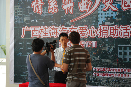 桂海的工作人員在捐款現(xiàn)場(chǎng)接受媒體采訪
