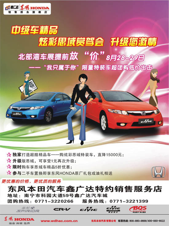 獨家打造超酷精品車——購炫彩思域特裝車,直降15000元;