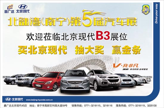 9月2日至4日(3、4日延長至晚上10點),在東盟會展中心舉辦的第五屆北部灣車展,鑫廣達北京現(xiàn)代部份車型最高有2萬元優(yōu)惠,還有超值禮包贈送!另有機會參與南寧購物節(jié)抽獎活動,贏取金條!機會千載難逢,多喜臨門的等著您呢!