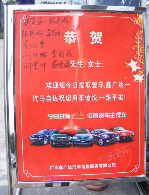 (廣西汽車網(wǎng) 訊)日前剛結(jié)束了兩大車展,小編走訪了今天夏季銷售情況如火如荼的鑫廣達一汽馬自達4S店,店內(nèi)提車的客戶很多,在店門前交車的看板上滿滿當(dāng)當(dāng)?shù)膶懼袢仗彳嚨能囍髅,交車音樂聲不斷響起?/STRONG>