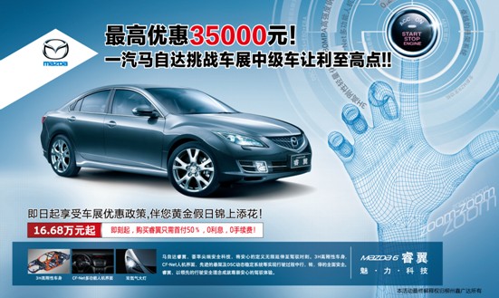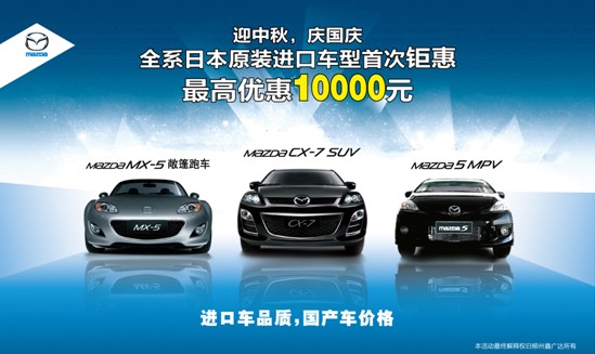 迎中秋,慶國慶,廣西柳州汽車貿(mào)易園第十屆汽車展銷會一汽馬自達全系最高優(yōu)惠35000元,挑戰(zhàn)柳州車展中高級車讓利至高點!全系日本原裝進口車首次鉅惠,最高優(yōu)惠10000元。真正實現(xiàn)進口車品質(zhì),國產(chǎn)車價格!
