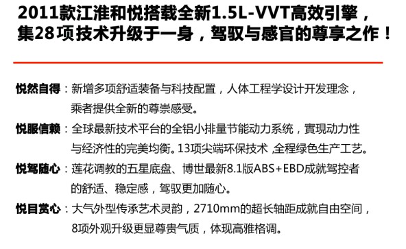 一流的技術成就了優(yōu)異的品質(zhì), 2011款和悅的動力綜合性能得到大幅提升。最大扭矩達到146N•m / 4000rpm,提升了12.3%,最大功率達到83KW / 6000rpm,提升了9.2%,以1.5L的排量動力趕超了大部分1.6L排量的合資品牌和自主品牌,動力優(yōu)勢明顯。同時,新動力升級也帶來了產(chǎn)品的輕量化和良好的燃油經(jīng)濟性,和悅2011款發(fā)動機重量85kg,減輕了29.4%;百公里油耗5.6L,降低了8.9%,而且在工信部權威油耗指標中綜合油耗甚至低于部分排量1.3L的車型。