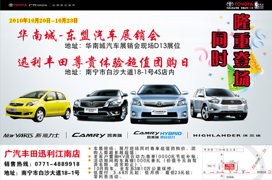 為回饋消費者鼎力支持,廣汽豐田迅利江南店將在10月20日—10月23日推出“尊享體驗超值團購日”活動,另外該團購活動也將在華南城汽車展銷會D13展位同步進行,敬請感興趣并有意向購車的朋友可移步到南寧市白沙大道18-1號4S店內或華南城汽車展銷會D13展位看車、購車,參與到團購超值的活動中來。
