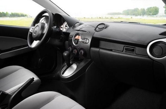 馬自達2采用了跑車?yán)渚谏鱼y色裝飾的設(shè)計方式,很具動感。儀表盤是白色底,邊緣鑲嵌了鍍鉻裝飾,速度表盤大的有些夸張,絕對算的上個性。中控臺各面板布局也很時尚,不過馬自達2空調(diào)面板有些靠里,在車輛行駛中操作有些不便。