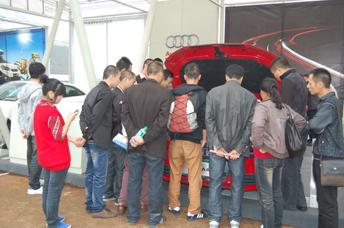 連續(xù)的廣告轟炸讓我不得不開(kāi)始關(guān)注這個(gè)西部名城汽車巡展了。到底是什么車展搞的這么有氣勢(shì)呢?“二十余品牌,百款靚車,千元優(yōu)惠券,百萬(wàn)讓利”。10月16日,車展的第一天,我?guī)е@份好奇來(lái)到了樂(lè)山市體育中心,大紅條幅高高掛,“2010第二屆西部名城汽車巡展樂(lè)山站歡迎您”。走進(jìn)展場(chǎng)第一眼看到的就是奧迪的展位。A4L、A5兩款靚車被人群緊緊包圍。別看樂(lè)山只是個(gè)二級(jí)城市,開(kāi)奧迪的人可不少,咱樂(lè)山人有錢。