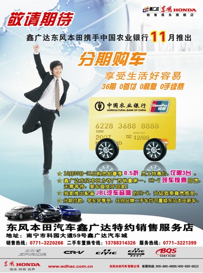 鑫廣達東風本田與農業(yè)銀行強強聯手,推出農行信用卡車貸業(yè)務。在規(guī)定的購車時間內,購買任何一個車型均可享受0首付、0利息、0手續(xù)費的全免業(yè)務。輕輕松松把您的愛車“貸回家”。