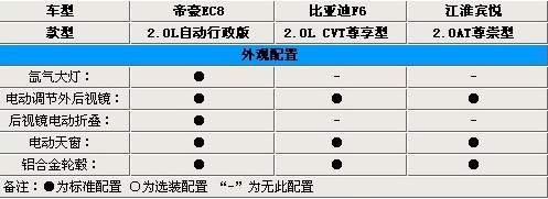 外觀配置方面,帝豪EC8為使用者提供了帶大燈清洗功能氙氣大燈,彰顯奢華氣質(zhì)。像電動(dòng)調(diào)節(jié)后視鏡、電動(dòng)天窗和鋁合金輪轂等基礎(chǔ)型配置,三款車也都給予了提供。不過,比亞迪F6和江淮賓悅為配備電動(dòng)折疊后視鏡,略顯大意。