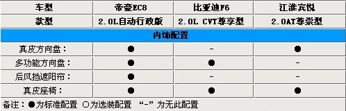 內(nèi)部配置方面,三款車均為使用者提供了真皮座椅。而帝豪EC8和江淮賓悅還為使用者提供了真皮方向盤,但是比亞迪F6提供的方向盤多功能按鍵或多或少彌補(bǔ)了一些不足。三款車僅有帝豪EC8配備了后風(fēng)擋遮陽簾,既不會讓后排乘客被曬到,也增加了后排乘客的私密性。