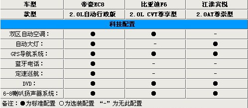車內(nèi)便利性科技配置和娛樂配置方面,帝豪EC8顯示出了比較明顯的優(yōu)勢。作為一款中高級商務(wù)轎車,GPS導(dǎo)航系統(tǒng)這種基礎(chǔ)配置,三款車都給予了提供。帝豪EC8和比亞迪F6為使用者提供了雙區(qū)自動空調(diào),方便主駕和副駕根據(jù)自己的需求對溫度進(jìn)行調(diào)整。帝豪EC8還為使用者配備了十分便利的藍(lán)牙電話和定速巡航系統(tǒng),方面日理萬機(jī)的商務(wù)人士可以隨時應(yīng)付商務(wù)問題。