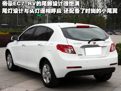 帝豪EC7-RV的尾部設(shè)計(jì)很飽滿(mǎn),黑色后保險(xiǎn)杠護(hù)板讓整個(gè)尾部倍顯緊湊。尾燈設(shè)計(jì)與頭燈遙相呼應(yīng),頂部配備了時(shí)尚的小尾翼。從帝豪EC7-RV的尾部我們可以看出,它與三廂版車(chē)型完全是兩種概念,所涉及的人群也更年輕化,不過(guò)歐系車(chē)的設(shè)計(jì)理念還是始終貫穿在整體設(shè)計(jì)中。