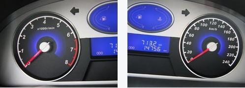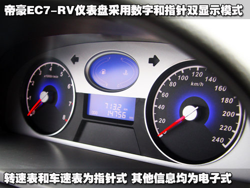 帝豪EC7-RV的儀表盤同樣采用數(shù)字和指針雙顯示模式,彰顯動感與豪華,藍色背景光夜間看起來也很舒服。中間的橢圓形顯示屏顯示油量和水溫,下面的長方形顯示屏則顯示一些常用的車輛信息。