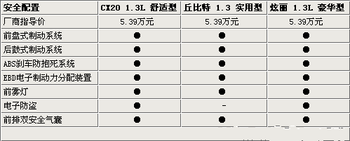 作為一款家用經濟型轎車,最重要的就是安全性能,以上三款車雖然并沒有什么突出的表現,但基本的安全配置卻一樣沒有省下。長安CX20、丘比特、炫麗都配備了ABS+EBD系統(tǒng)和雙安全氣囊。略覺得有些遺憾的是,這三款車型無一例外,都采用前排后鼓的制動系統(tǒng),也并沒有太出色的主動安全配置。