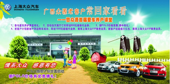 11月13日(星期六)上海大眾廣西眾源4S旗艦店店將舉辦“老客戶;丶铱纯呆呤讓脨(ài)車養(yǎng)護(hù)課堂活動(dòng)”,為老客戶講解愛(ài)車養(yǎng)護(hù)知識(shí),并開(kāi)展現(xiàn)場(chǎng)實(shí)踐演練。參與養(yǎng)護(hù)課堂將贈(zèng)送500元維修代金券,同時(shí),舉辦新POLO上市價(jià)格有獎(jiǎng)競(jìng)猜,現(xiàn)有POLO大幅度巨額優(yōu)惠。并且,老客戶如果介紹新客戶購(gòu)車成功,老客戶還將有千元代金券贈(zèng)送、享受上海大眾尊貴會(huì)員!