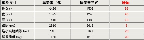 與第二代福美來相比,福美來三代車型的外形尺寸都有大幅的提高,其中長度增加69毫米,寬度增加45毫米,高度增加了70毫米。而且福美來三代的軸距達到2615毫米,比二代車型加長5毫米。福美來三代還加高了離地間隙,達到160毫米,使這款新車的通過性更好。同時,因為車身尺寸的的加大,福美來第三代車型的整備質(zhì)量也增加了90公斤。