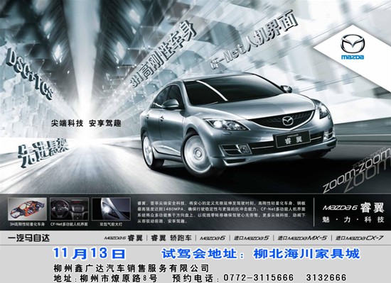 11月13日,一汽馬自達柳州鑫廣達將在柳北海川家具城舉行本年度最后一次試駕會,屆時將會有巨大優(yōu)惠公布。最后一次瘋狂體驗,最后一次激情試駕!機會不容錯過!