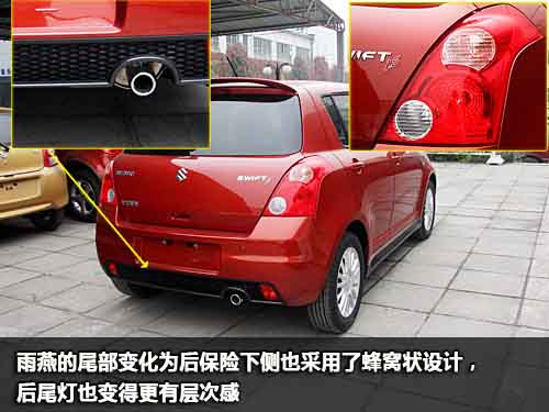新雨燕的車身腰線從前大燈一直向后延伸至尾燈,黑色玻璃包覆的A柱和B柱在增加了雨燕整體感的同時,也進一步加強了運動氣息的釋放。車尾設計中,新雨燕的后保險杠也改成了蜂窩狀造型,尾燈經(jīng)過重新設計后也顯得更有層次感。