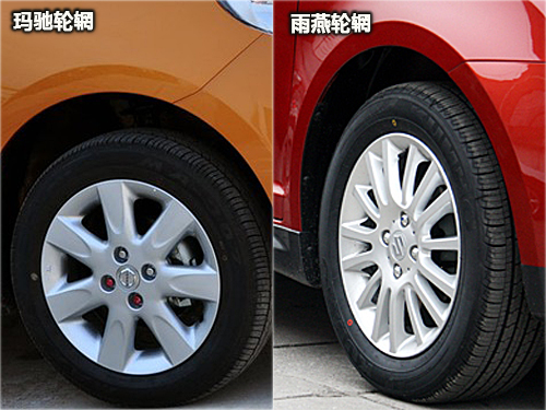 在輪胎輪輞選擇上,兩車都配備了15英寸鋁合金輪輞,雨燕運動版的輪輞設計較之瑪馳的更加突出活力。當然,為了提供更好的抓地力,該車配備的185/55 R15輪胎在胎面寬度上也要比瑪馳采用的175/60 R15輪胎寬一點。