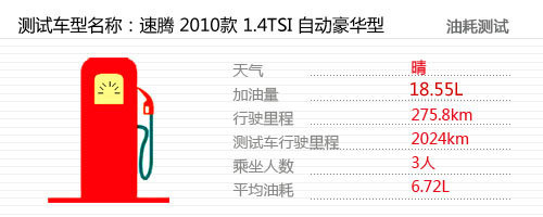 測試油耗還是使用經(jīng)常能碰到的路況進(jìn)行測試,其中包括城市擁堵路段,城市環(huán)路,高速公路,國道,鄉(xiāng)村路段以及山路。是目前實(shí)現(xiàn)起來最簡單、數(shù)據(jù)最公證的測試方法。行駛了接近276公里之后,我們又將油料補(bǔ)充至瓶口加油機(jī)上顯示的就是此次油耗測試的耗油量為:18.55升。最終這臺速騰1.4T車型在搭載三人的情況下平均油耗僅為6.72升。