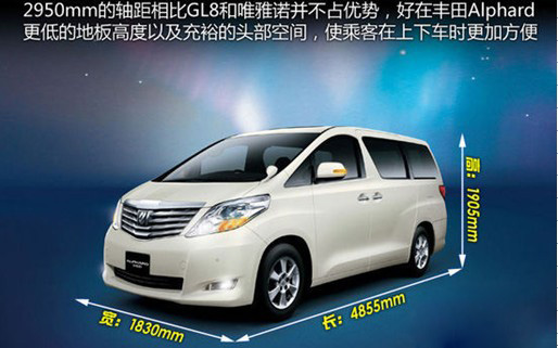 單看豐田Alphard那極具氣勢(shì)的外觀,很少會(huì)有人懷疑他在空間上的表現(xiàn)。事實(shí)上豐田Alphard除了1905mm的高車(chē)身,4855mm的長(zhǎng)度和1830mm的寬度均比GL8和唯雅諾略小一線(xiàn),而2950mm的軸距也欠缺競(jìng)爭(zhēng)力。不過(guò)好的一面是豐田Alphard擁有更低的地板以及充裕的頭部空間,使乘客在上下車(chē)時(shí)更方便。