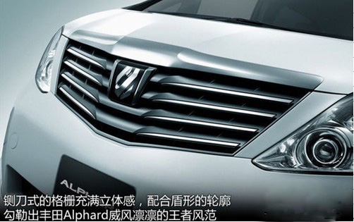 專(zhuān)為亞洲市場(chǎng)量身定做的外形,豐田Alphard從外到內(nèi)均融入了國(guó)人所喜愛(ài)的豪華、大氣以及儒雅氣質(zhì)。給人不怒自威的前臉充滿(mǎn)霸氣,采用雙色鍍鉻的鍘刀式格柵充滿(mǎn)立體感,配合盾形的輪廓勾勒出豐田Alphard威風(fēng)凜凜的王者風(fēng)范。