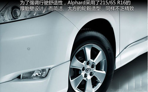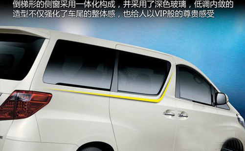 倒梯形的側(cè)面車(chē)窗是豐田沿用已久的設(shè)計(jì),這在豐田海獅等MPV車(chē)型中也有見(jiàn)到。后側(cè)窗采用一體化構(gòu)成,并采用了深色玻璃,低調(diào)內(nèi)斂的造型不僅強(qiáng)化了車(chē)尾的整體感,也給人以VIP般的尊貴感受。此外,為了強(qiáng)調(diào)行駛的舒適性,豐田Alphard采用了215/65 R16的厚胎壁設(shè)計(jì),而簡(jiǎn)潔、大方的輪轂造型,同樣不乏精致。